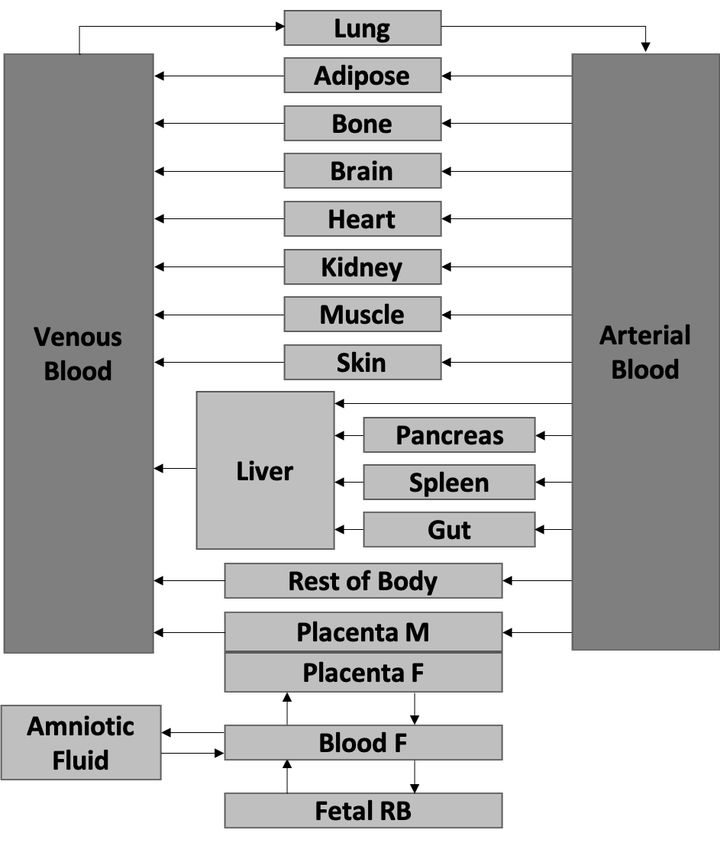 Model structurePregnancy causes extensive physiological changes impacting drug exposure in mother and fetus. Predicting a drug’s pharmacokinetic (PK) profile is crucial to ensuring safe and efficacious dosing during pregnancy. Conducting clinical PK trials in pregnancy, however, is both logistically and ethically challenging. Physiologically-based (PB) PK models can provide in silico predictions of drug exposures during pregnancy by accounting for known physiologic changes. These models can guide dosing prior to drug administration and refine dosing once initial exposures are determined.